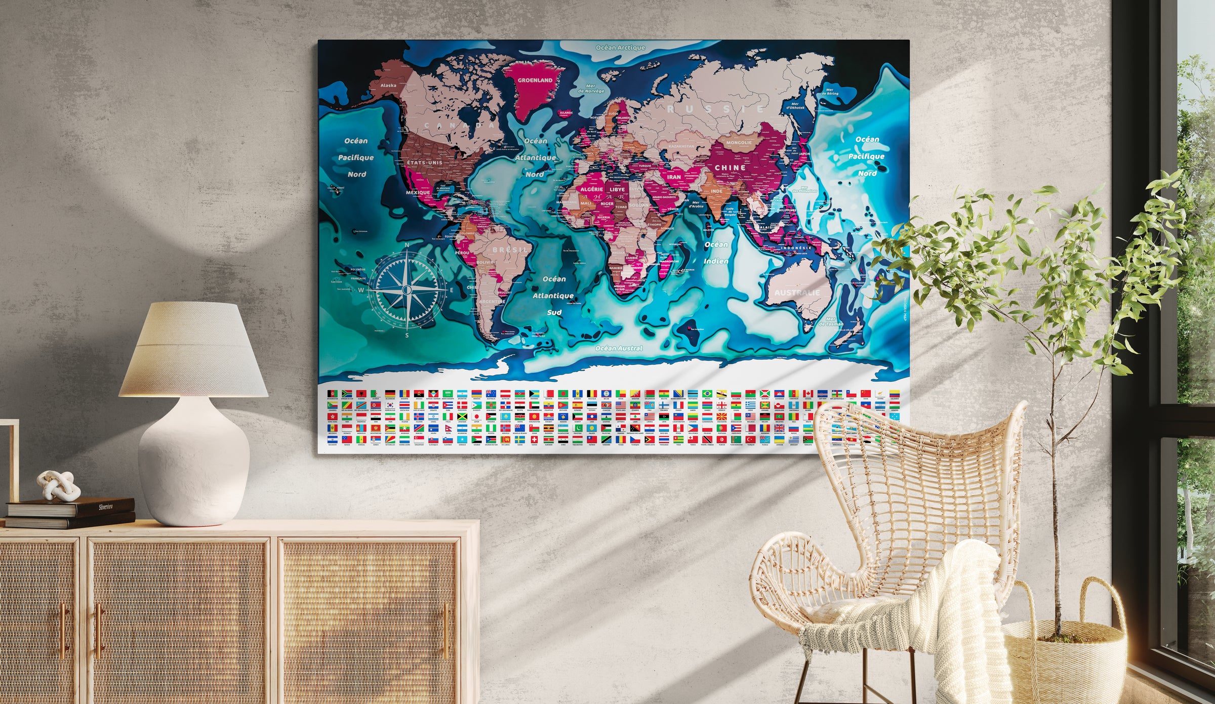 Erhältlich in 3 Versionen: mit Flaggen für ein spielerisches und umfassendes Kennenlernen der Länder der Welt, ohne Flaggen… und ohne Antarktis für eine schlichte und elegante Ästhetik, die Ihre Wanddekoration aufwertet.